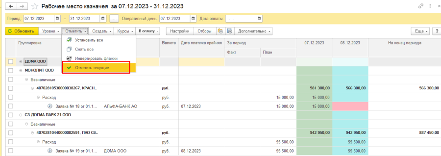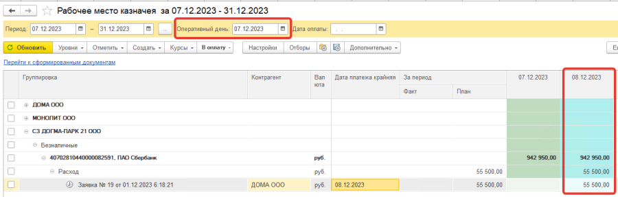 - Перенести в оперативный день - дата оплаты в платежной позиции меняется на дату, указанную в шапке (Оперативный день). Например, оплата по ЗРДС была запланирована на 08.12.2023. В шапке Оперативный день = 07.12.2023. Значит, при переносе на оперативный день, дата оплаты в платежной позиции изменится на 07.12.2023: