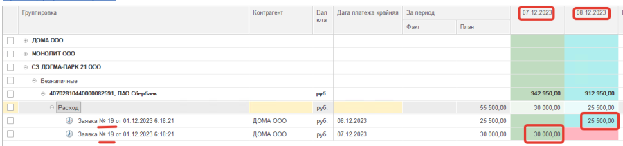 Если заявки на расходование ДС или планируемые поступления ДС были введены списком, то они выводятся в виде дерева, в котором на первом уровне сам документ, а на втором – платежные позиции или позиции поступления. Для Заявки на перемещение ДС и Заявки на перевод ДС в другую организацию в группе Расход показывается платежная позиция, а в группе Поступление – позиция поступления.