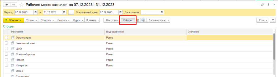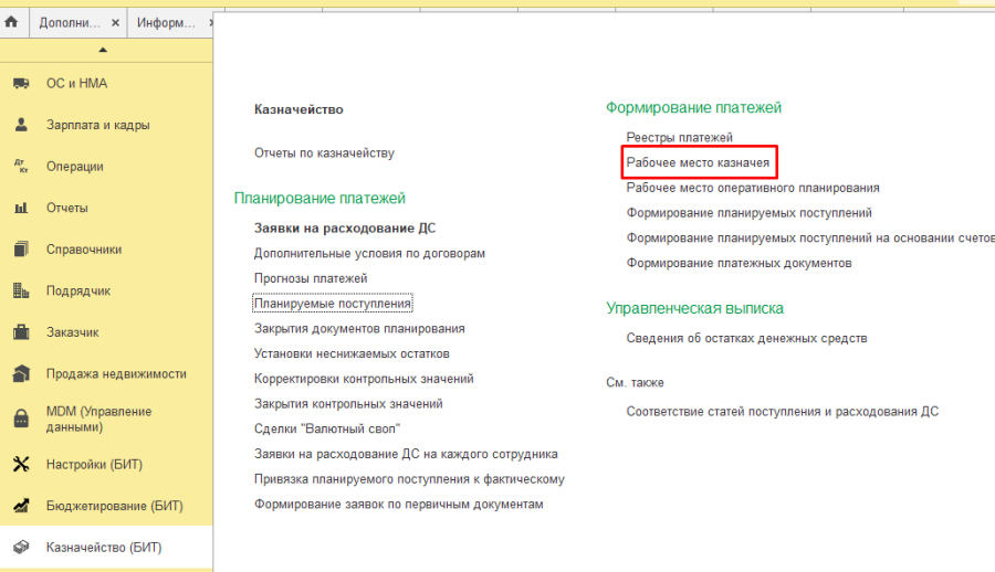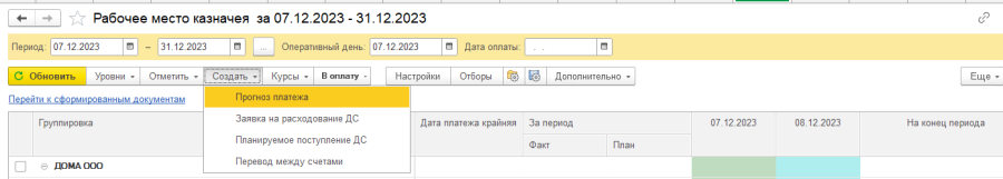 Обработка "Рабочее место казначея" (раздел "Казначейство" - "Рабочее место казначея") предназначена для осуществления оперативного планирования платежей и поступлений денежных средств: