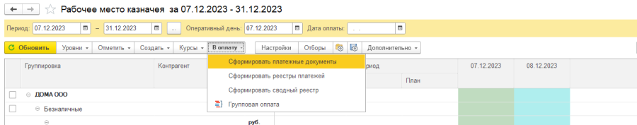 - "Сформировать реестры платежей" - будут сформированы документы "Реестр платежей" отдельно по каждой организации;