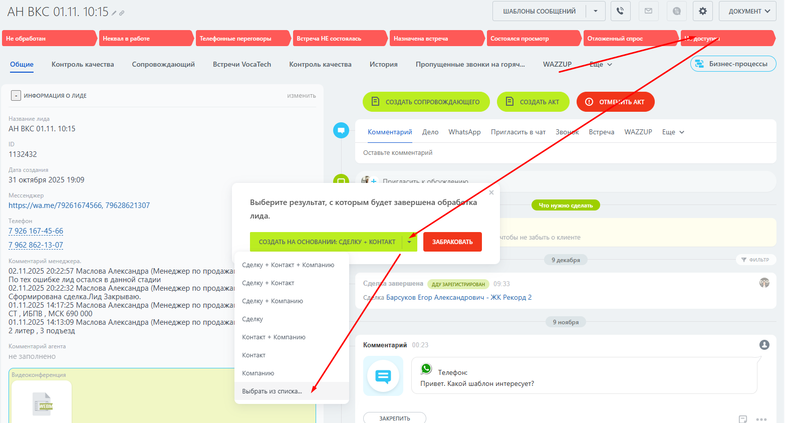 2. Открыть Лид и перевести его в финальную стадию. Нажать на стрелочку и Выбрать из списка