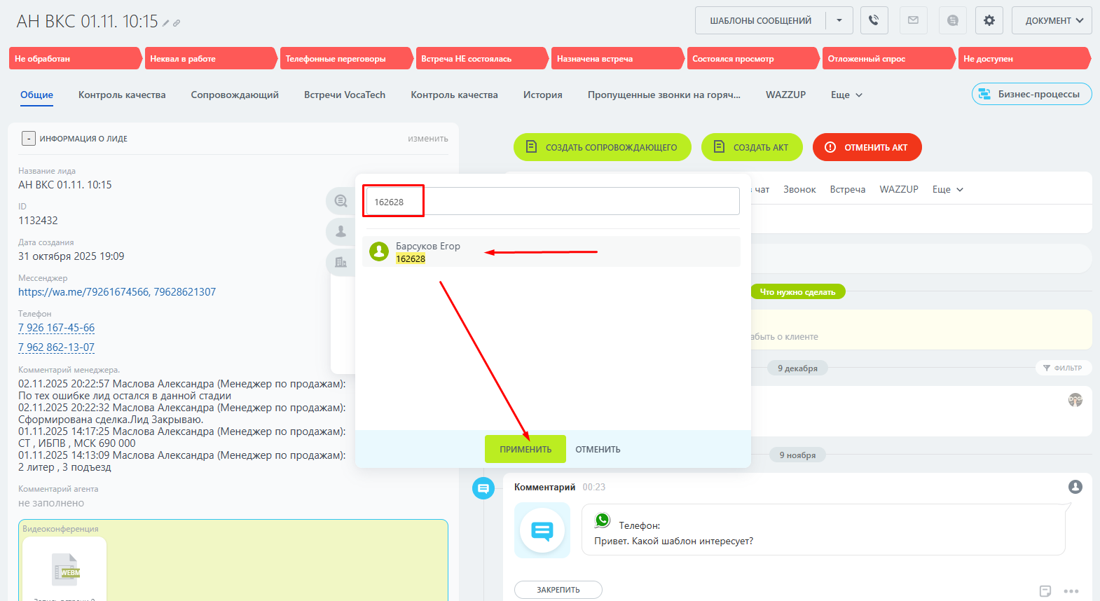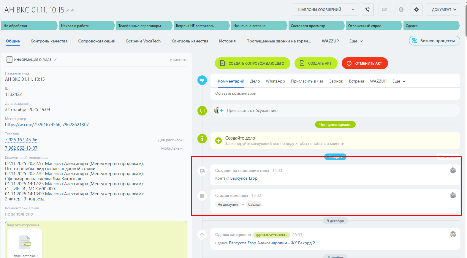 4. Подождать, пока изменения прогрузятся - откроется вкладка контакта поверх лида. Если ее закрыть, вы вернетесь в лид с измененной стадией