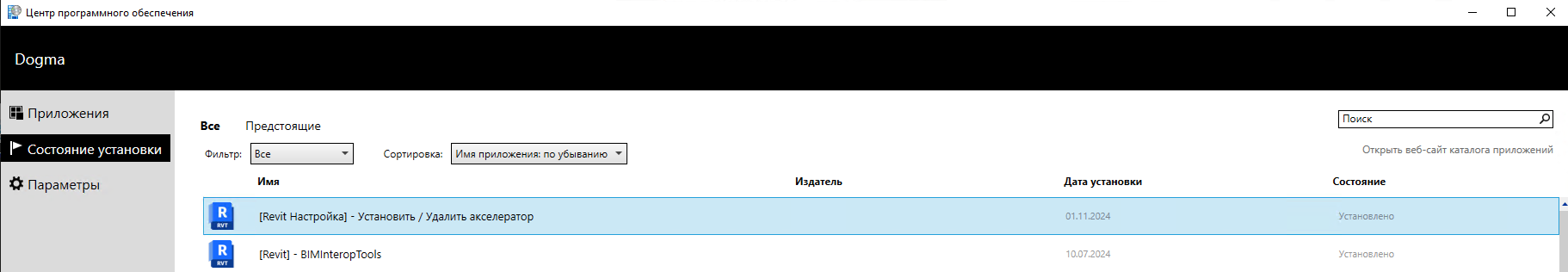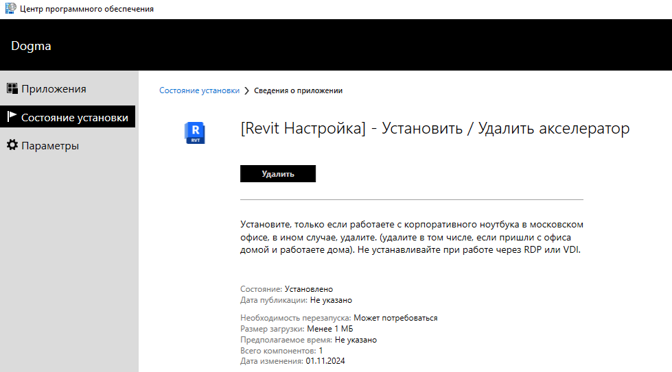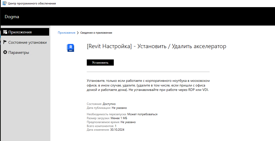 • Находим в списке в разделе "Состояние установки" Установить / Удалить акселератор, как на скриншоте ниже (можно также воспользоваться поиском справа)